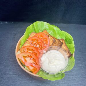 Soy Glazed Tofu, vegan mayonnaise, tomatoes, and mixed leaves.