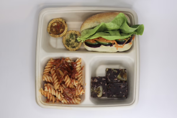 Our vegan friendly box contains a hummus & beetroot sandwich on ciabatta bread, roasted pepper & tomato pasta salad, vegan mini quiche, and a fruit salad or a ginger & orange crunch bites.