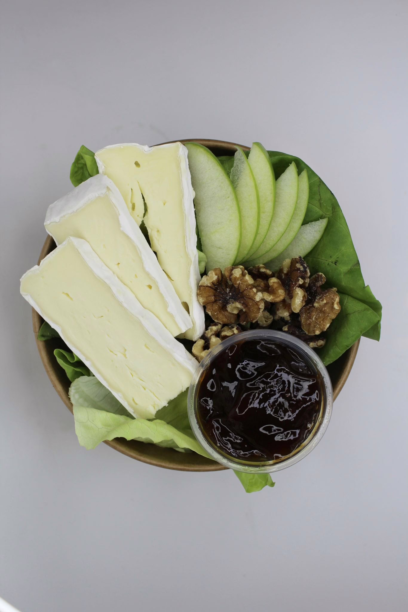 Apple/pear syrup, Brie cheese, apple, walnuts, and mixed leaves.