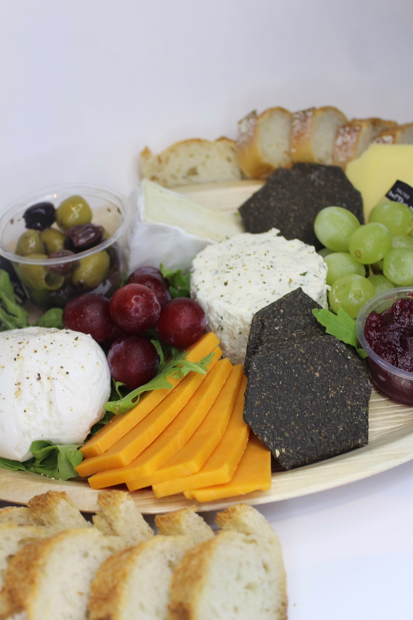 Boursin, red Leicester, mozzarella, cheddar, brie, caramelised onions, crackers, olives, grapes, cranberry sauce and French baguettes.