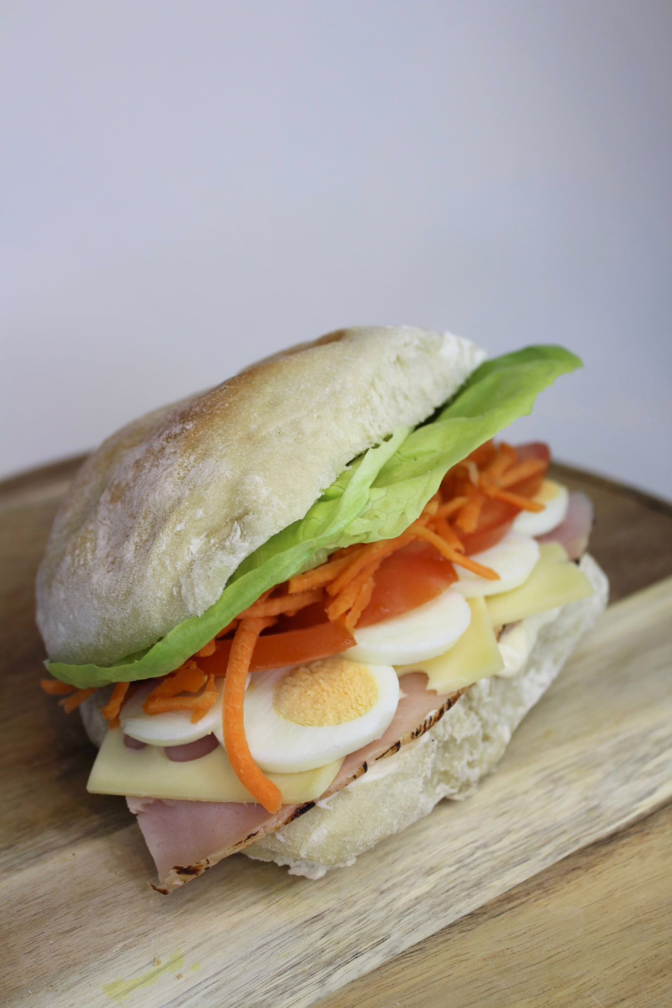 Roast Cheshire ham, Emmental cheese, creamy mayonnaise, eggs, crsipy carrots, juicy tomatoes, and mixed leaves, freshly made on award-winning La Chouquette bread.