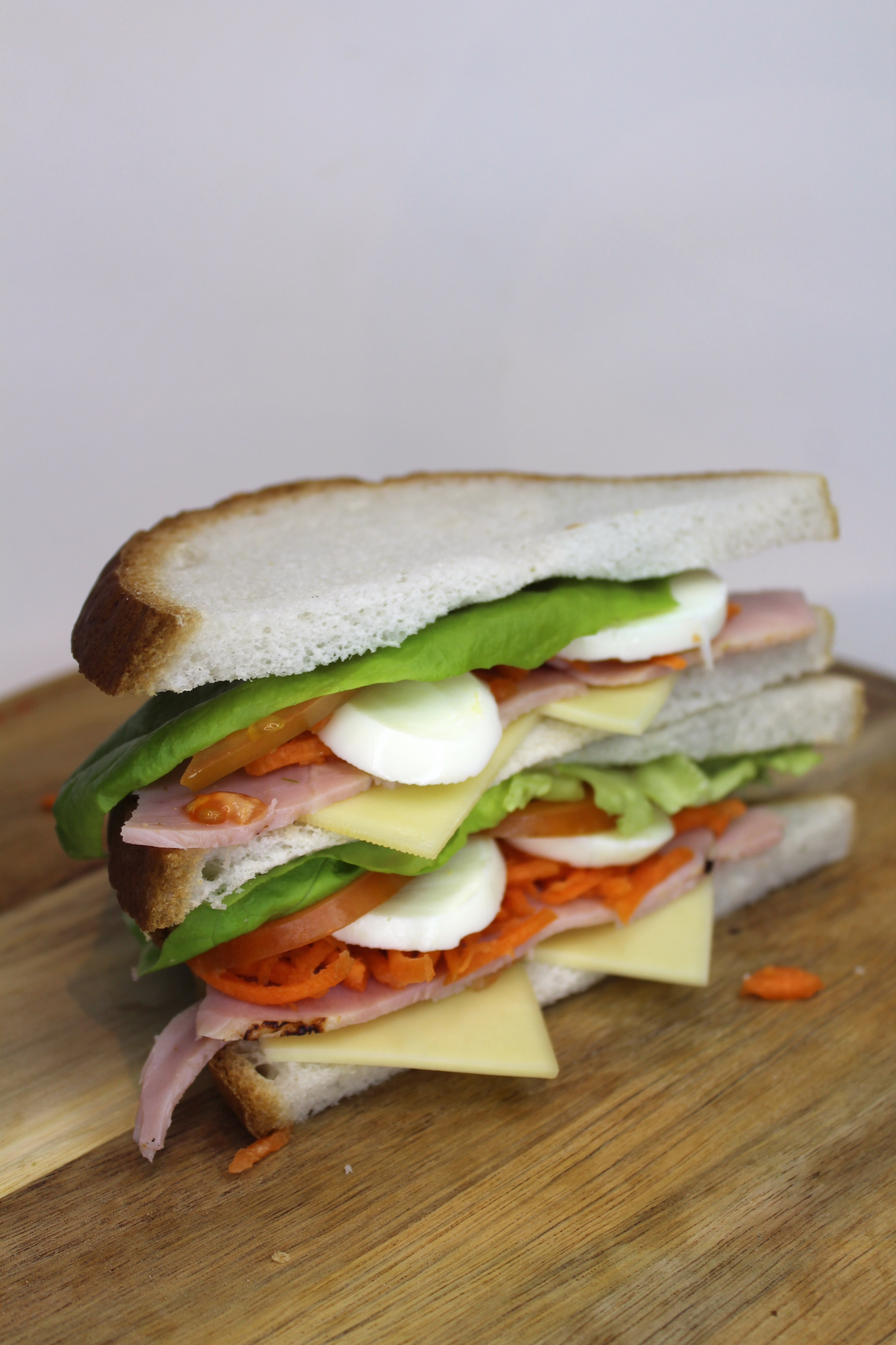 Roast Cheshire ham, Emmental cheese, mayonnaise, eggs, carrots, tomatoes, and mixed leaves, freshly made on gluten-free bread.