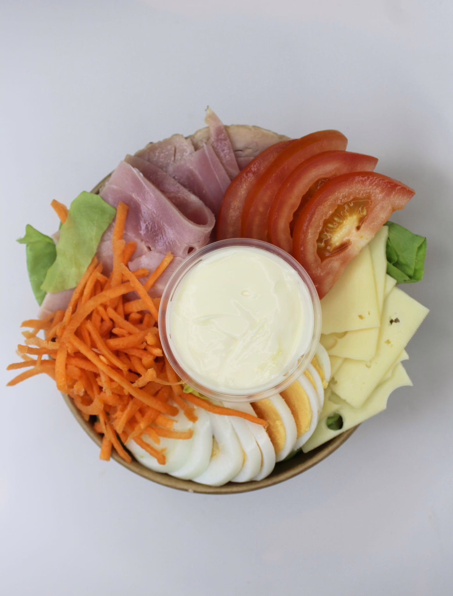 Roast Cheshire ham, Emmental cheese, mayonnaise, eggs, carrots, tomatoes, and mixed leaves.