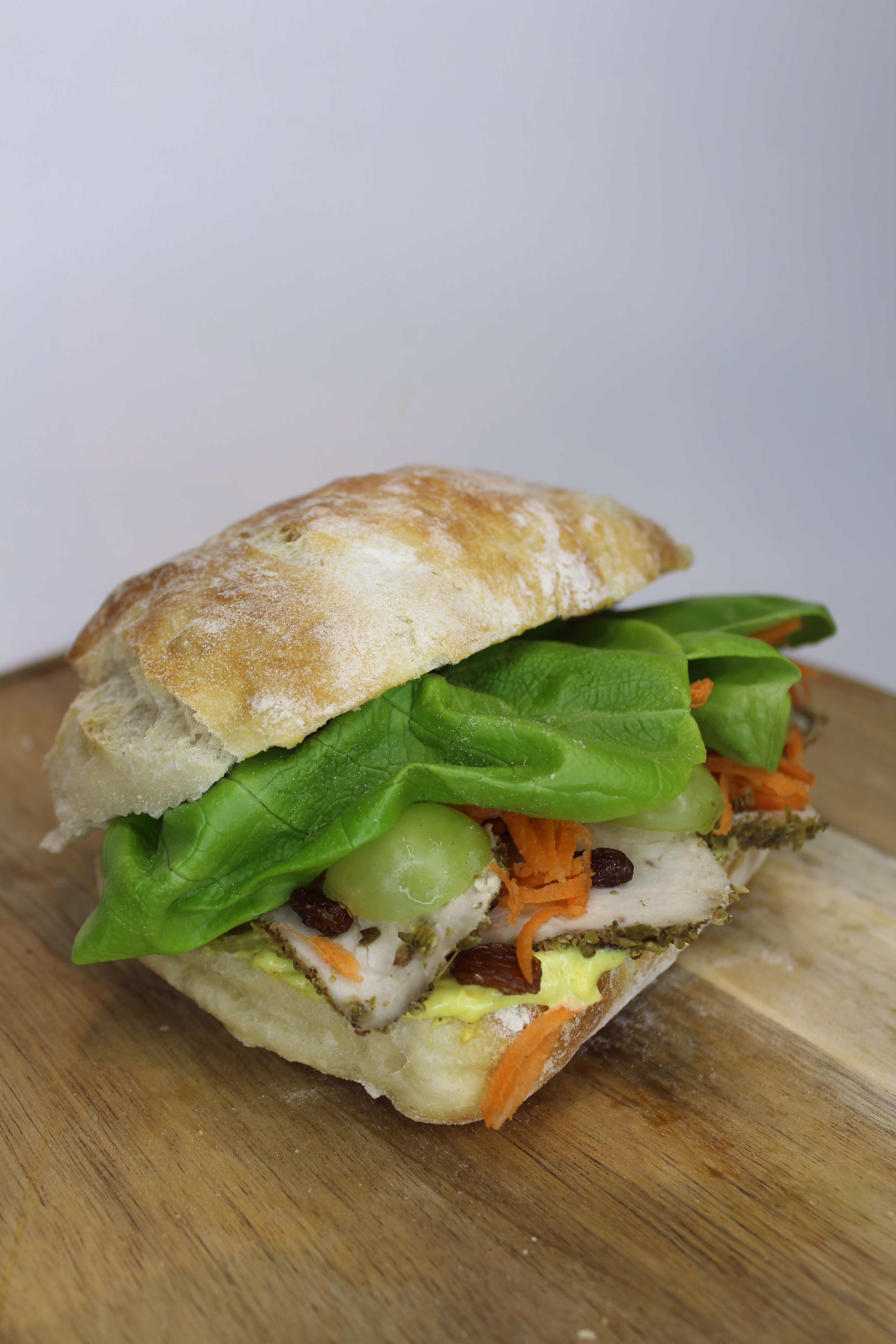 Tender British chicken breast, homemade curry sauce, grapes, raisins, crispy carrots, and mixed leaves, freshly made on award-winning La Chouquette ciabatta.