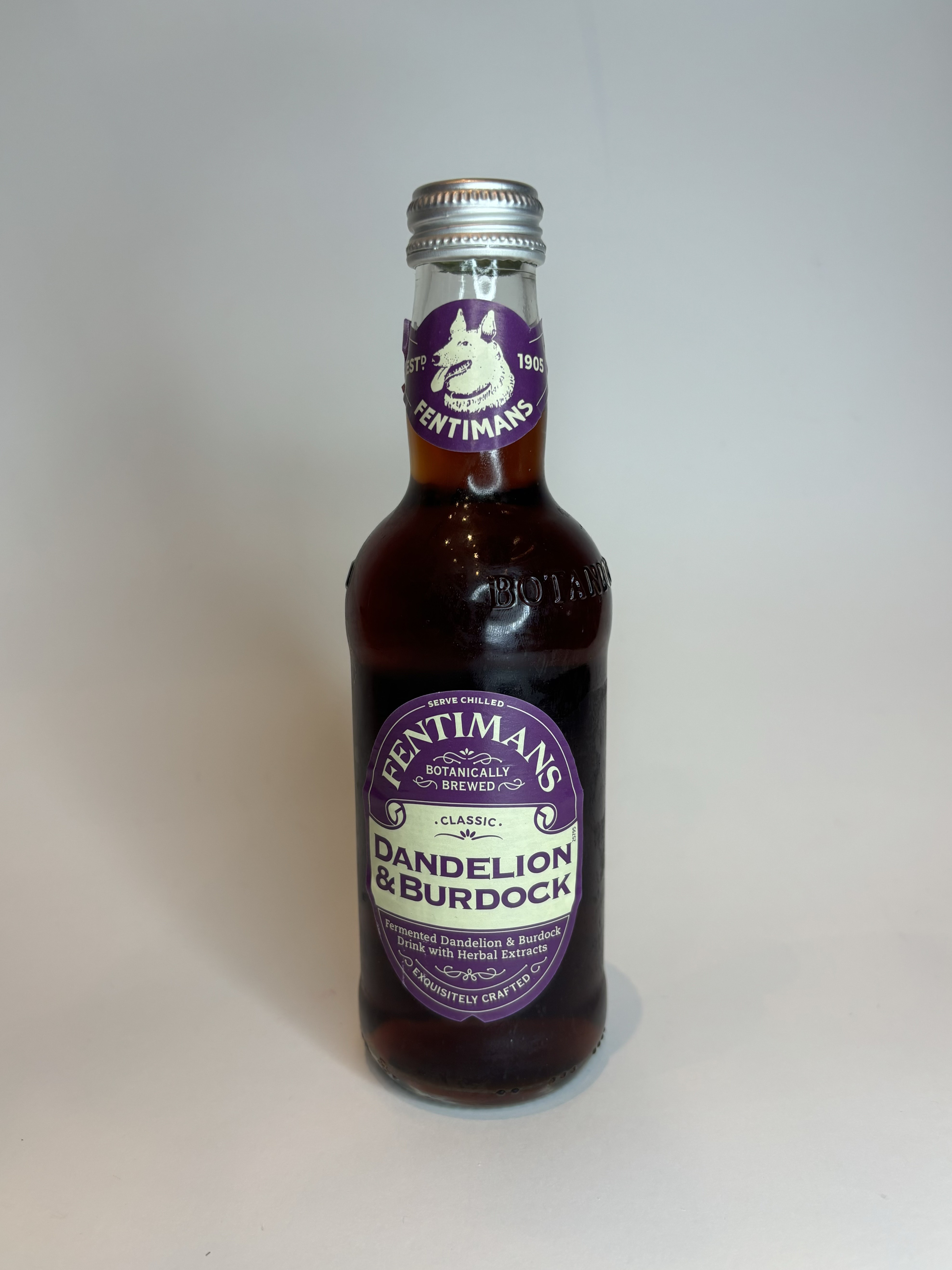 Fentimans Dandelion & Burdock bottled drink.