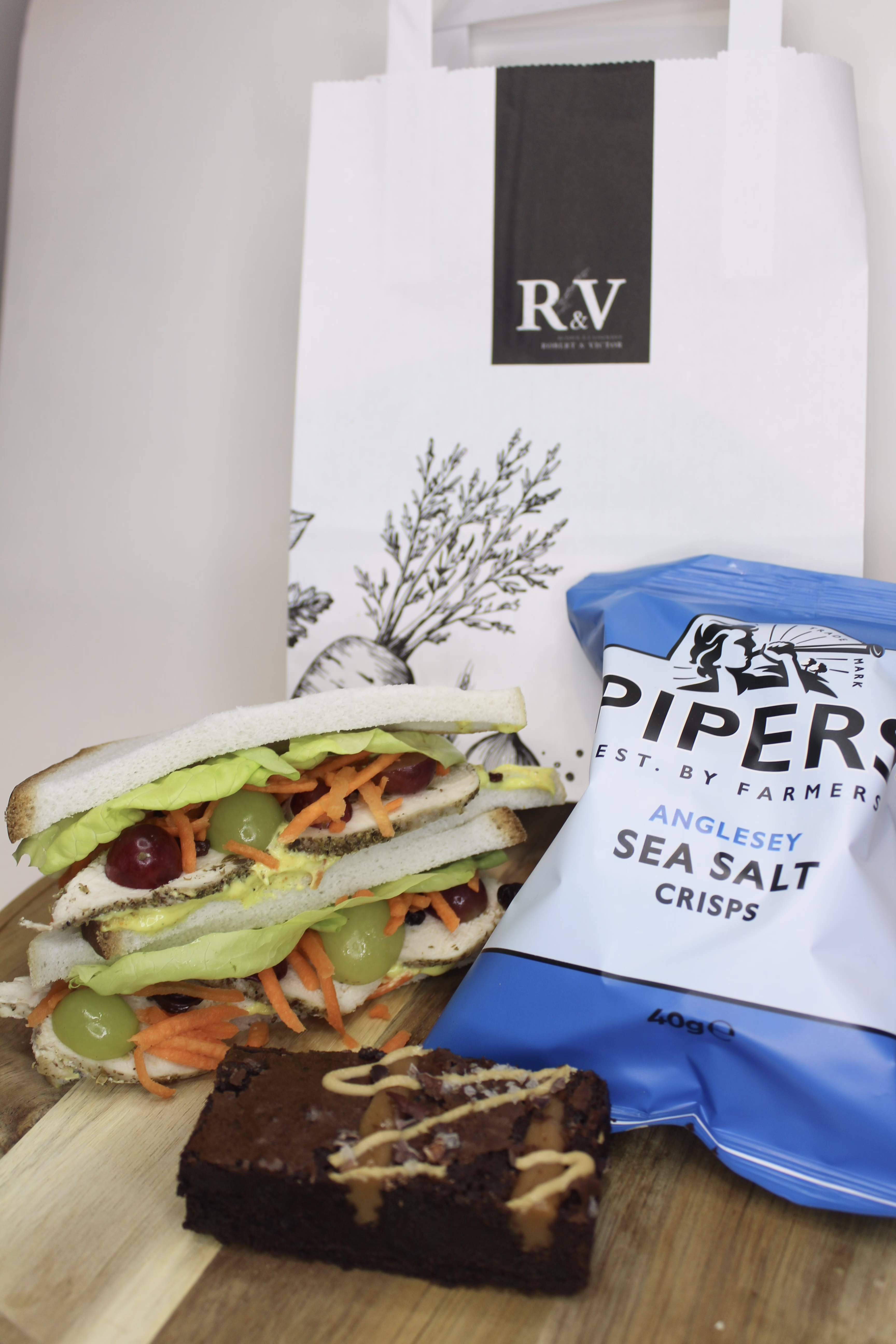 Our gluten free grab bag contains a GF coronation chicken sandwich, GF Manchester Tart Blondie/ fruit salad pot, and a bag of crisps.