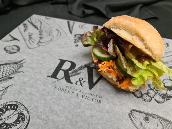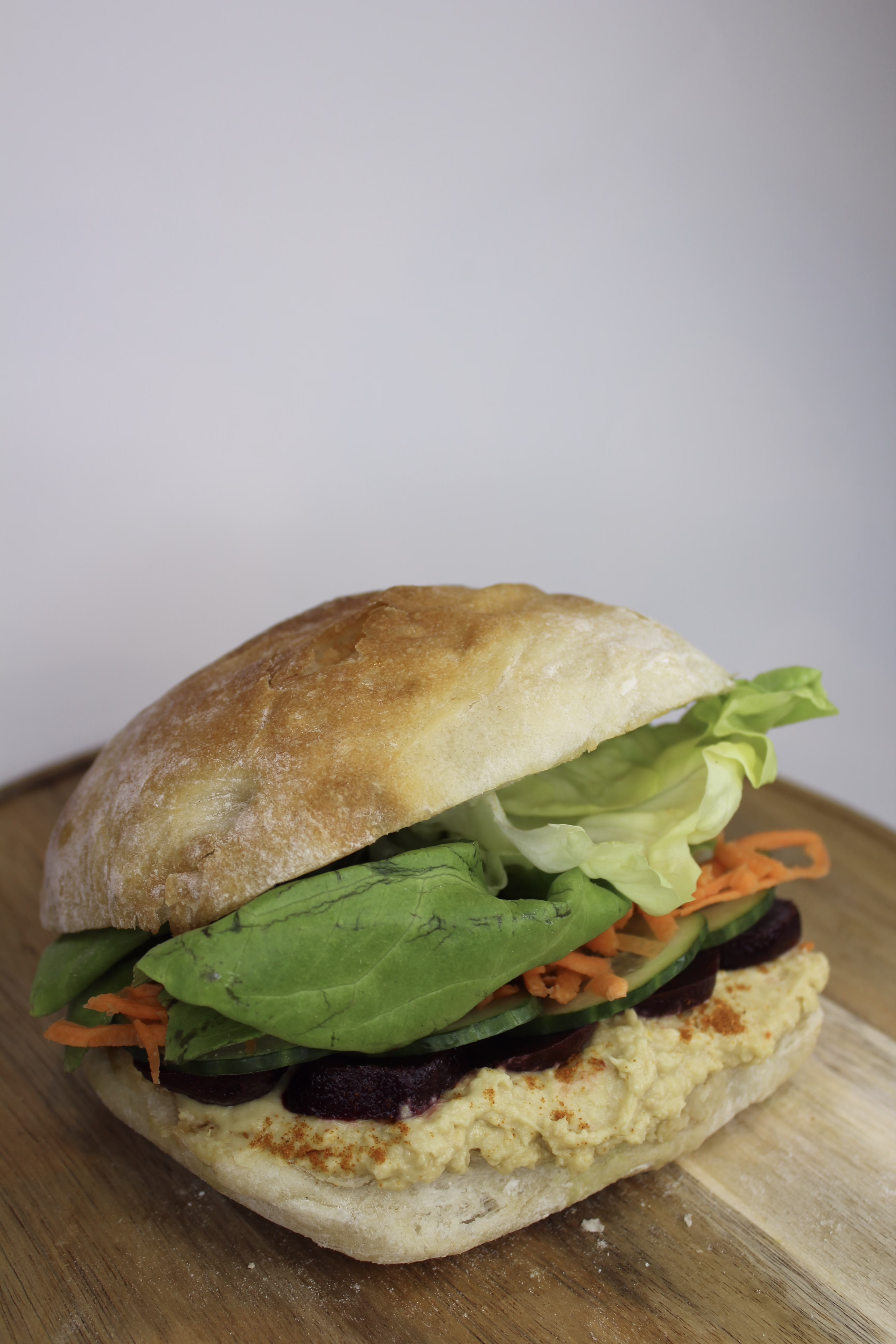 Hummus, beetroot, cucumber, carrots, smoked paprika, and mixed leaves on a ciabatta.