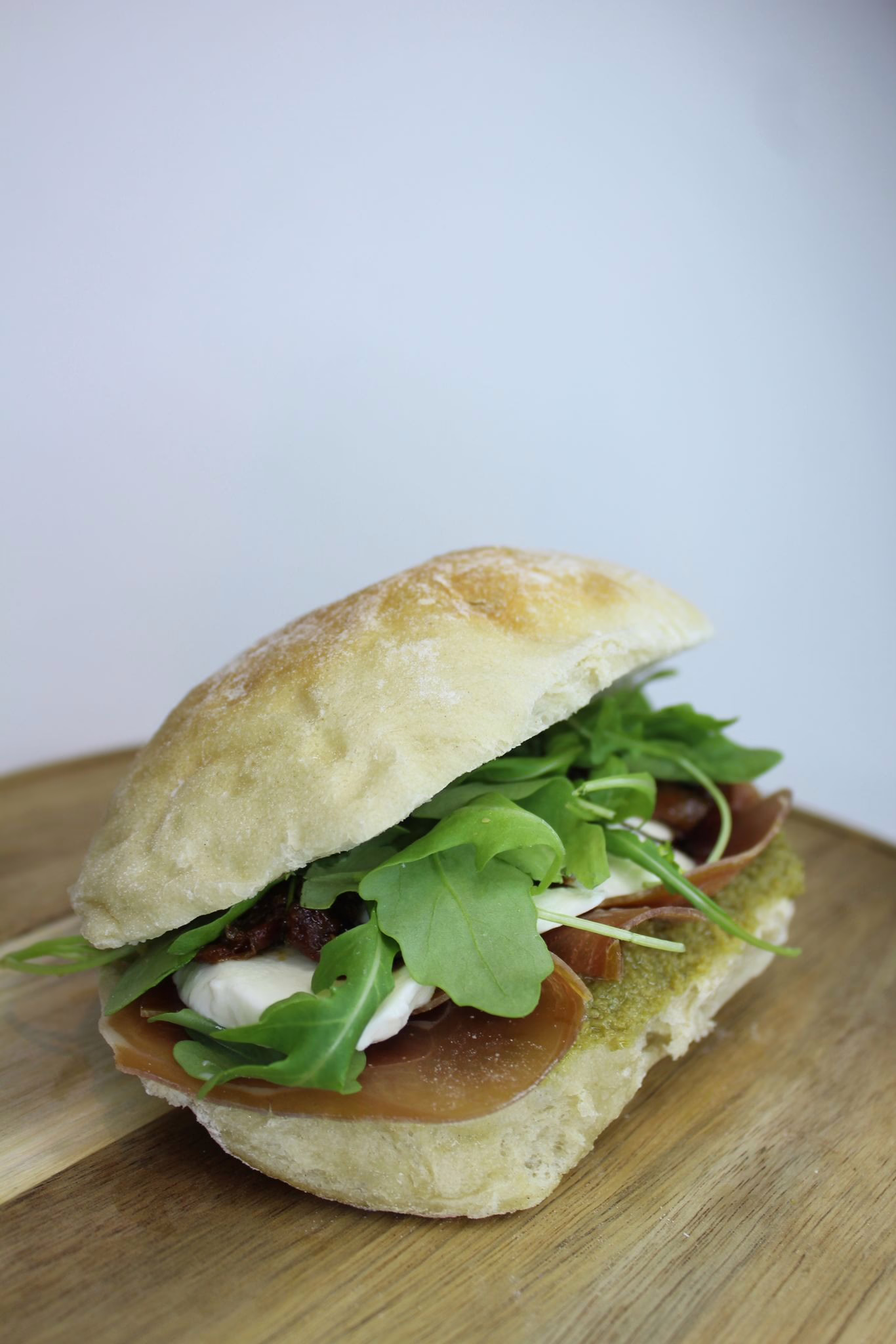 Fresh prosciutto, cremy mozzarella, homemade green tapenade, tangy balsamic glaze, and rocket, freshly made on award-winning La Chouquette ciabatta.