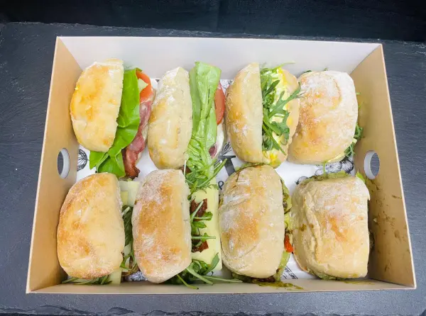 A mixed selection of mini-ciabatta breakfast sandwiches on La Chouquette bread.