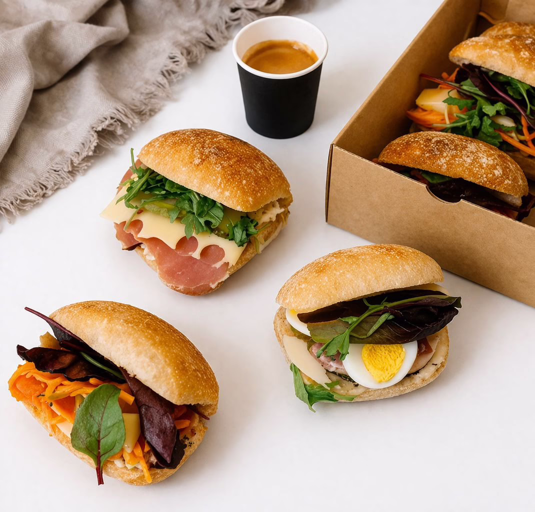 A mixed selection of mini-ciabatta sandwiches on La Chouquette bread. Our Originals box contains: Coronation Chicken, Spanish Chorizo, Cheshire Ham & Butter, and Roast Beef & Cheddar. Each platter comes in an eco-friendly box and is labelled with its contents.
