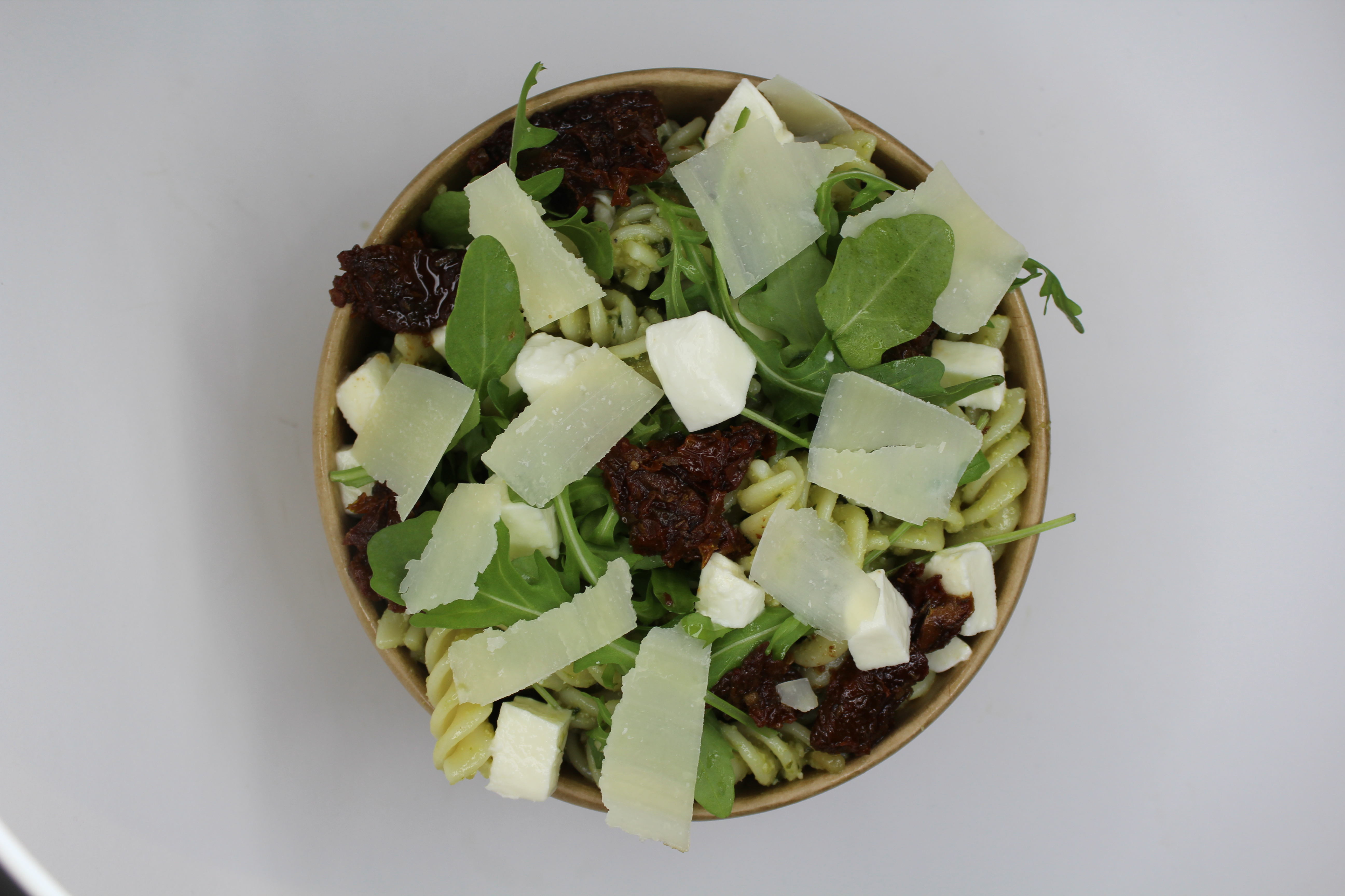A pesto pasta sharing salad for 4 people with sun-dried tomatoes, rocket, mozzarella and parmesan.