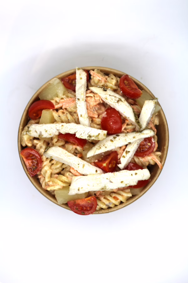 Cajun chicken pasta salad, perfect for sharing between 4 people. Packed with tender spiced chicken, pasta, and fresh tomatoes and lettuce, dressed in a creamy cajun sauce.