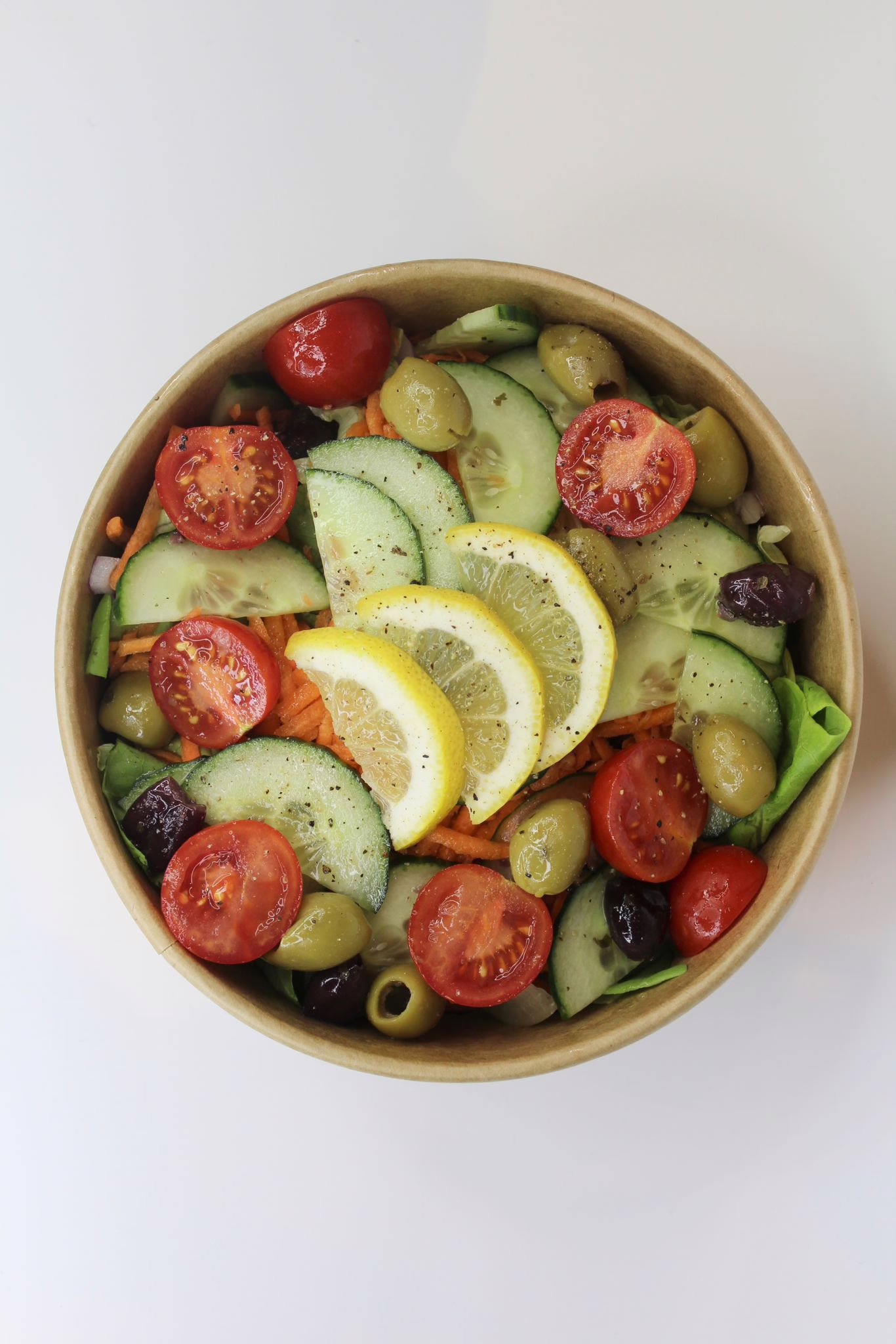 A Mediterranean salad perfect for sharing, with fresh flavours from a mix of olives, mixed leaves, cucumber, peppers, tomatoes, and herbs, ideal for 4 people to share every bite.