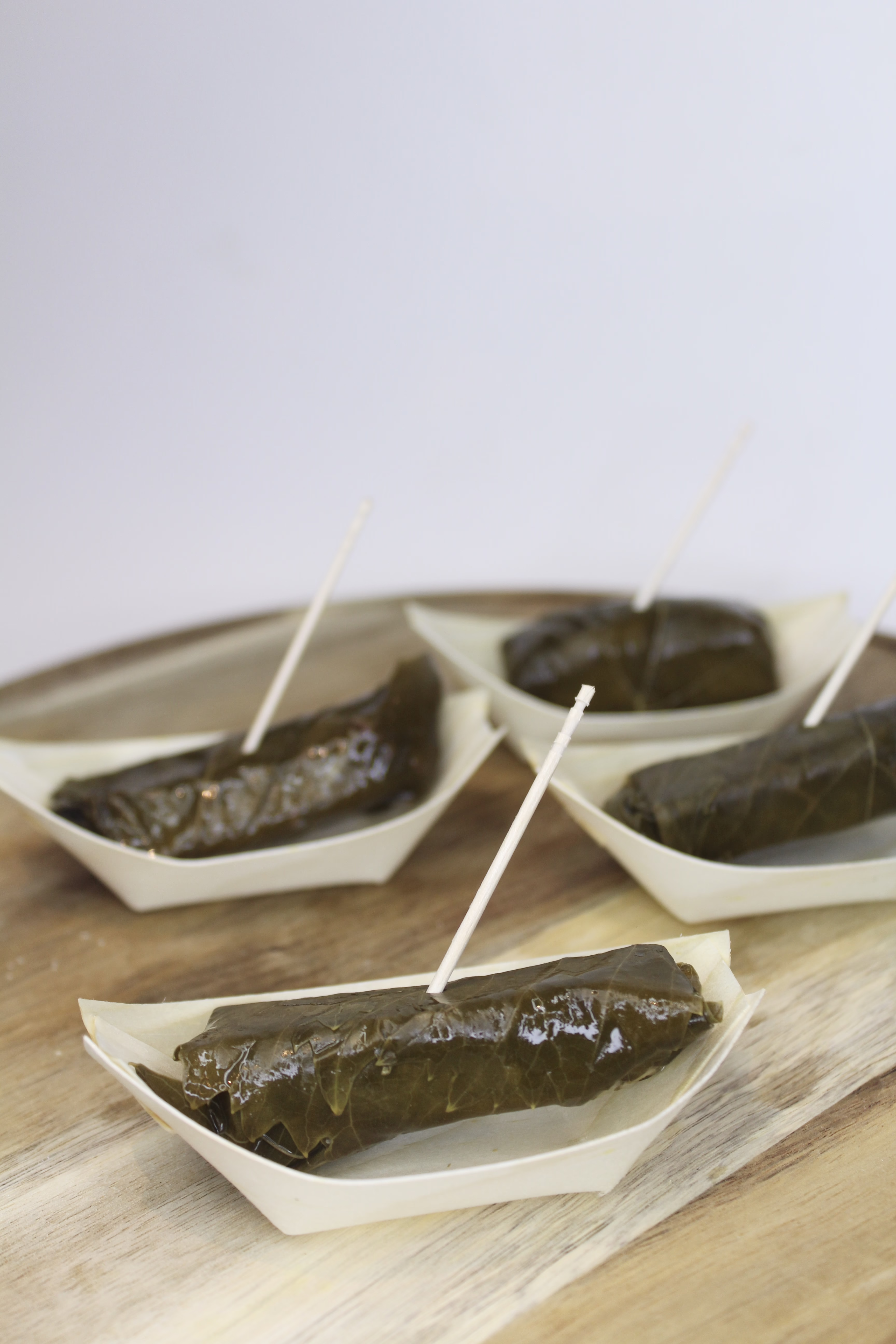 Tender vine leaves stuffed with mint and seasoned rice, creating a fresh vegan bite.