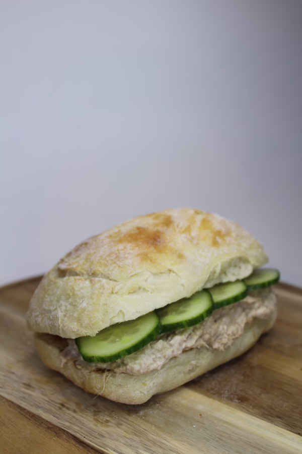 Homemade tuna salad blended with creamy mayo and herbs, topped with crisp cucumber slices, served in a freshly baked ciabatta.